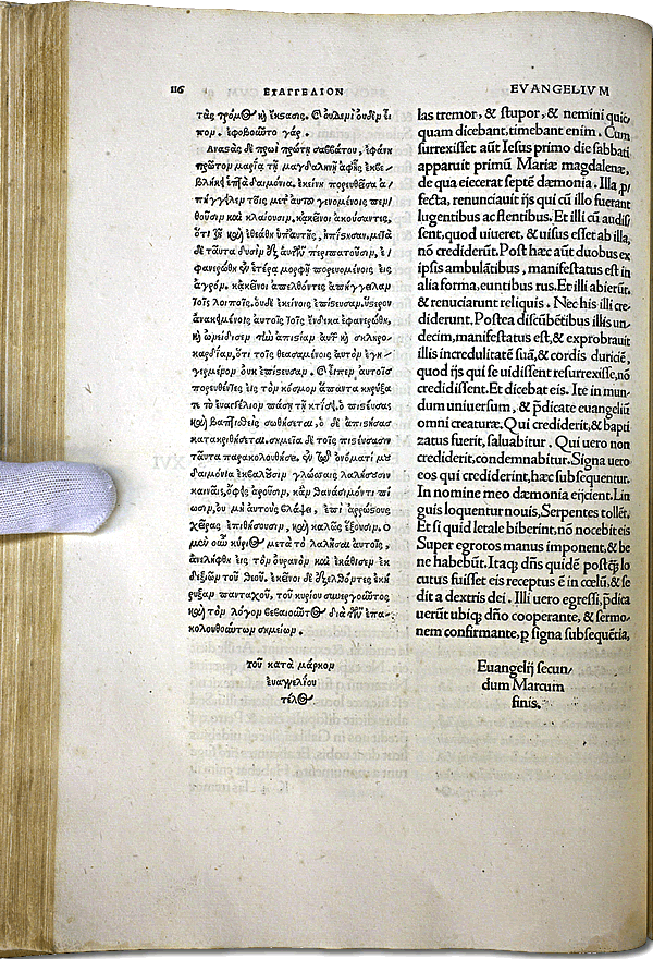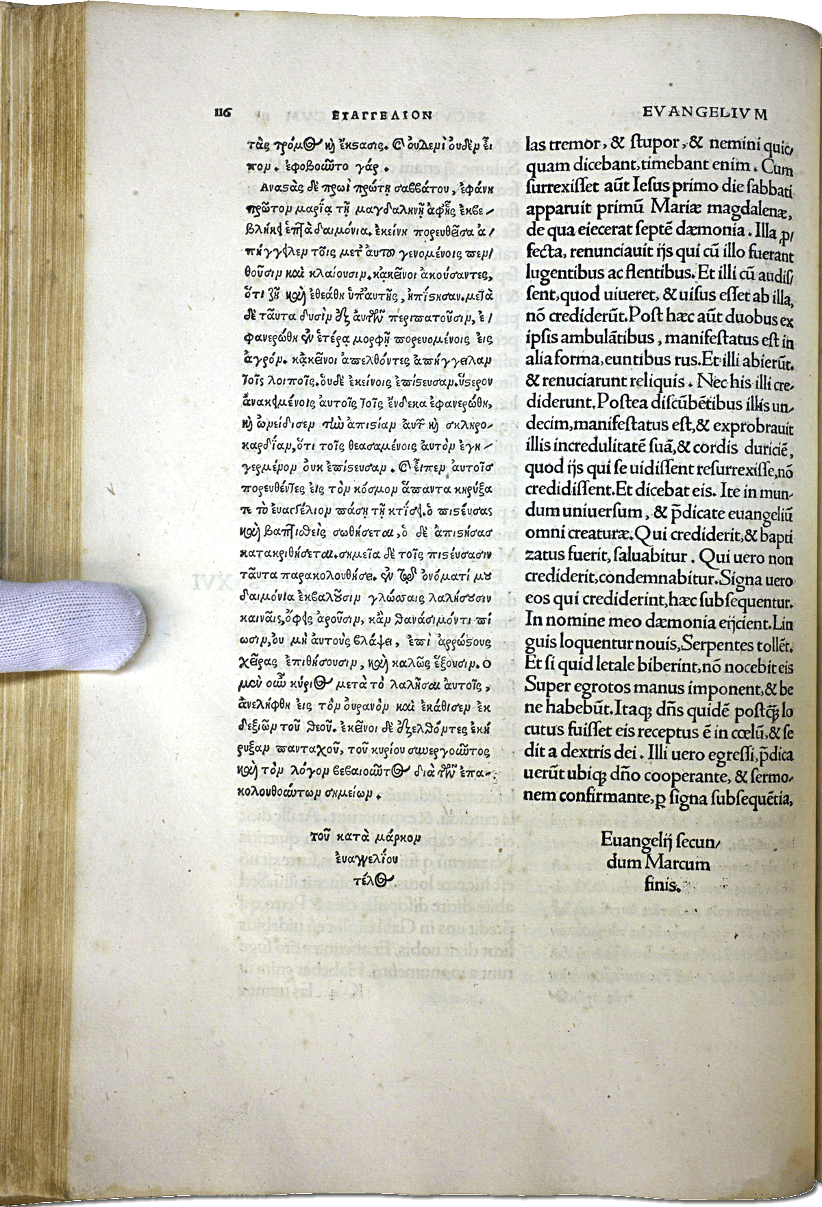 This is folio 59r of Erasmus's Greek New Testament. It shows last page of the gospel according to St Mark, chapter 16, with the Greek on the left and the Vulgate on the right. The text continues Mk.16.8 from page 115. The last paragraph of the Greek is the longer ending of Mark of the late Byzantine received text, Mk.16.9-20. (verse numbers didn't appear until Stephanus.)