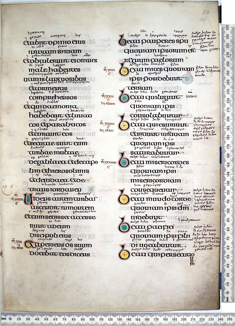This is folio 34r of the Gospel according to St Matthew, beginning at Mt.4:24. The Sermon on the Mount starts at Chapter 5 (going through to chapter 7) with the Beatitudes, continuing on this page to verse 18. The verso side of the folio is HERE.