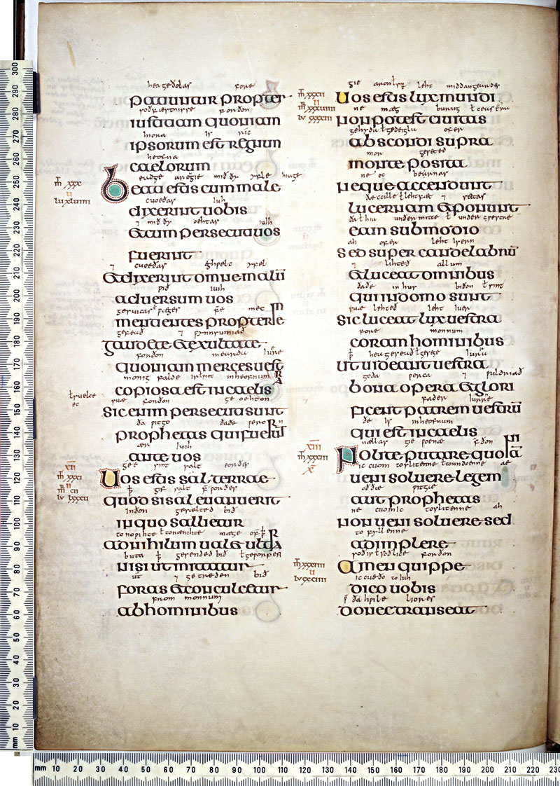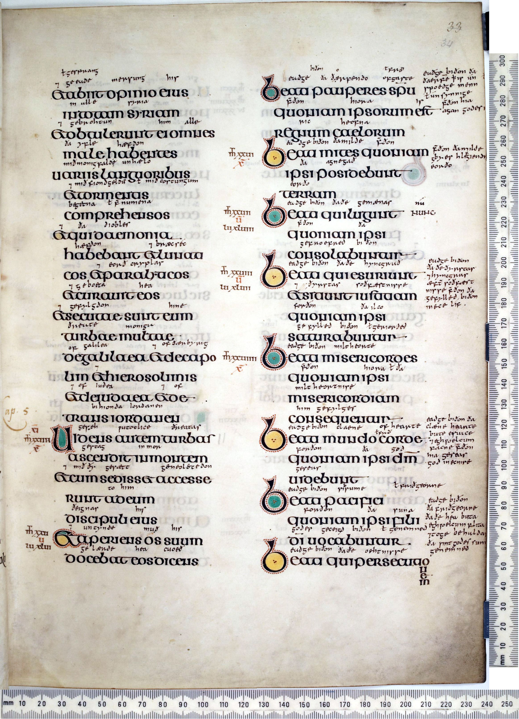 This is folio 34v which is from Matthew's Gospel. The setting is the Sermon on the Mount. Folio 34 v continues from folio 34r with the Beatitudes. The page ends part-way through chapter 5 verse 10.