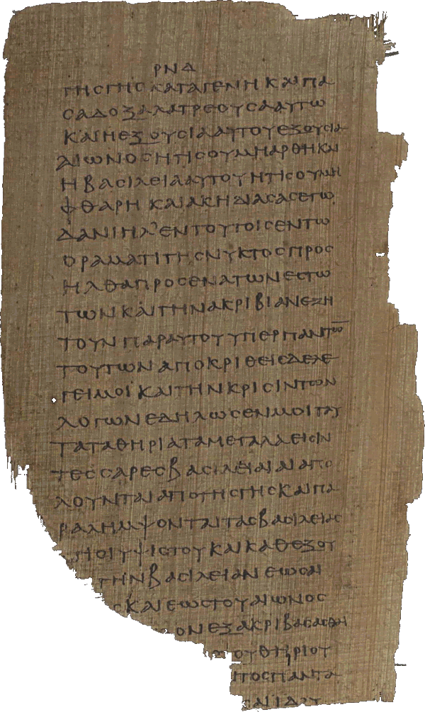 Folio 77 (Illustrated) is from P968 of Daniel from the CB Papyrus X collection. The book of Daniel in P968 is of the original Septuagint, not the Theodotion version. F77 contains on the verso side (default view), Dan.7.8-11; & on f77 recto, Dan.14-19.