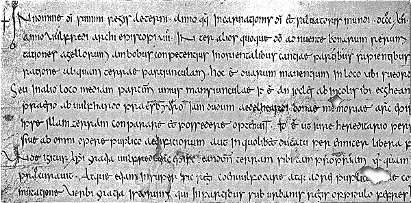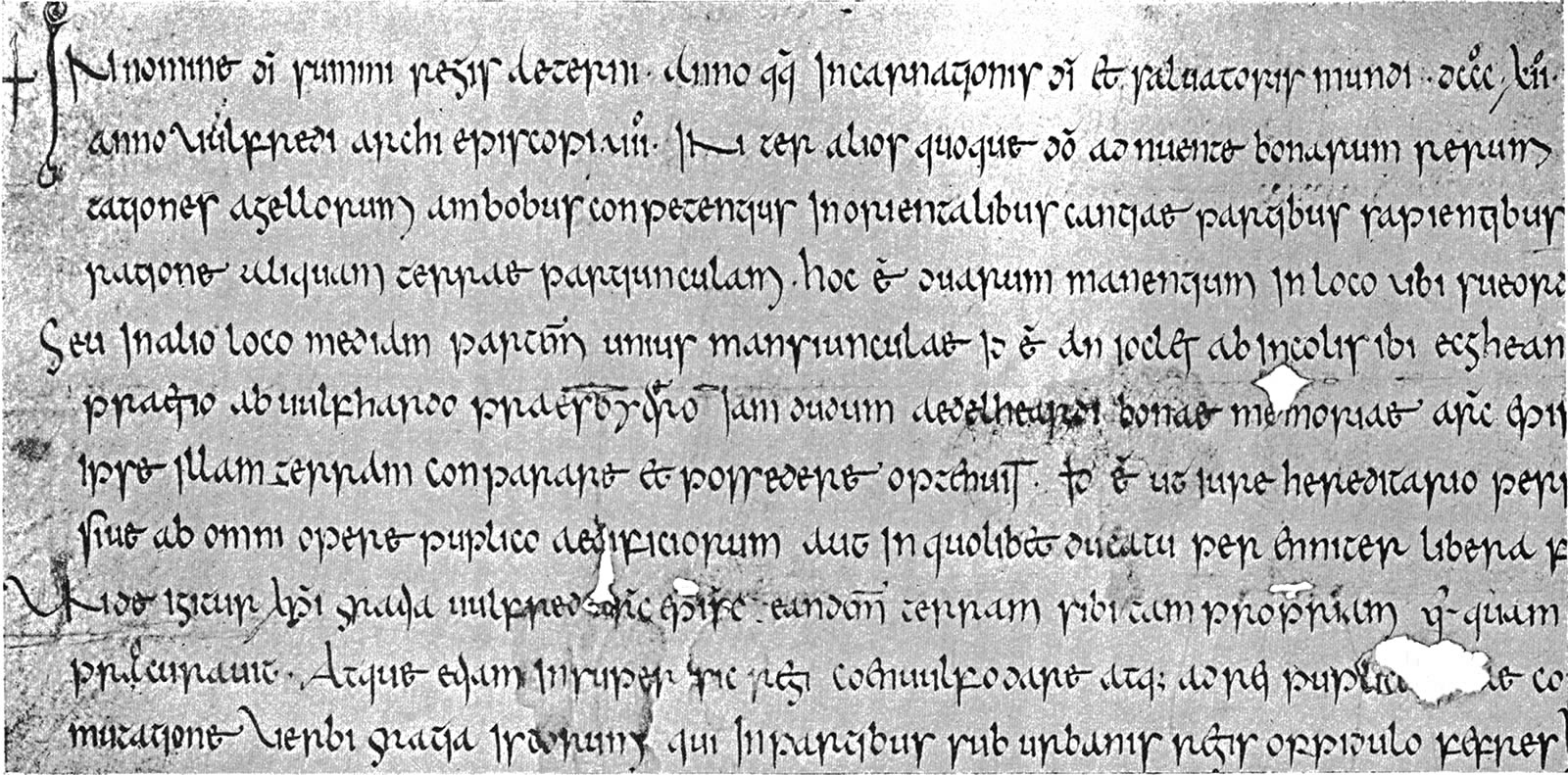 IN nomine dei summi regis aeterni . anno quoque incarnationis dei et salvatoris mundi . decco . xiio . — | anno uulfredi archi-episcopi . viio . INter alios quoque deo adnuente bonavum rerum— | tationes agellorum ambobus conpetentius in orientalibus cantiae partibus sapientibus— | ratione aliquam terrae partiunculam . hoc est duarum manentium in loco ubi sueord— | Seu in alio loco mediam partem unius mansiunculae id est an ioclet ab incolis ibi ecghean— | praetio ab uulfhardo praesbyt'e´ro iam dudum aec͋elheardi bonae memoriae archiepis— | ipse illam terram conparare et possedere optenuit . id est ut iure hereditario per— | sive ab omni opere puplico aedificiorum aut in quolibet ducatu perenniter libera f— | UNde igitur christi gratia uulfred archiepiscopus eandem terram sibi tam propriam et quam— | pracuravit . Atque etiam insuper sic regi coenuulfo dare atque ad rei puplic[ae bona]e co— | mutatione verbi gratia istorum qui in partibus suburbanis regis oppidulo fefres[ham]