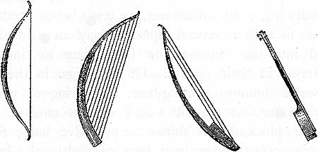 The gradual development of string-instruments into various species is a subject of so great interest, that a Plate is here appended giving the outline of the more important of each group, starting from the primitive hunting-bow, the playful twanging of the strings of which in idle moments most probably led to the construction of all musical instruments of this class. This suggestion is painfully unpoetical, and cannot for one moment hold its own, as far as romance goes, against the pretty stories as to the origin of such instruments handed down from remote times amongst nearly every great race of mankind. But it is, nevertheless, practically true; and, moreover, its truth is not overthrown by the fact that several species may occasionally be merged into one another, or from time to time have over-lapped in their growth.
