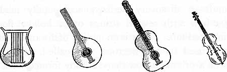 The most primitive material used for strings was, probably, twisted grass; next in time, the guts of animals; lastly, wire or silk. String-instruments closely allied to two or more of the family-types depicted in the Plate are both numerous and interesting. The harp- lute, a favourite instrument at the close of the last century, good specimens of which may even now be often found in the shops of instrument-makers, possessed characteristics of both harp and lute, having certain strings passing over a fretted finger-board; while others were open at the back. In the harpsichord, keys acted on little plectra which plucked the strings, what the ancient lyrists were compelled to do with their fingers assisted by a plectrum, is here done by the leverage of keys. In the pianoforte the hammers are no longer left in the hands of the player, but are also placed under the control of levers. The old German Streich-zither was a link between the guitar and fiddle; it was, as its name implies, a bowed-guitar. A similar transition is suggested by the old Italian viola-lyra (lyre-viol) [See Les Instruments a archet, par Antoine Vidal. (Paris, 1876.)], once a favourite instrument in this country [See History of the Violin, by Sandys and Forster. (London, 1864.)]. This transition is also implied by the fact that all early viols had frets like a lute or guitar; the frets were still in use when the instrument was called a violin and no longer a viol [See Playford's Introduction to the Skill of Music, where instructions are given for playing on this "cheerful and sprightly instrument . ... much practised of late." (l4th edition, 1700.)]. Nor have efforts been wanting to combine the effects of keys and bows; several instruments have from time to time been made in shape like a pianoforte, but containing catgut strings, "bowed" by a rotating resined wheel against which the action of the keys forced the strings. The modern zither combines the use of the plectrum of the ancient lyrist with the flat resonance-box and wire strings of the dulcimer. It has also certain strings over frets, thus possessing something in common with the lute family.