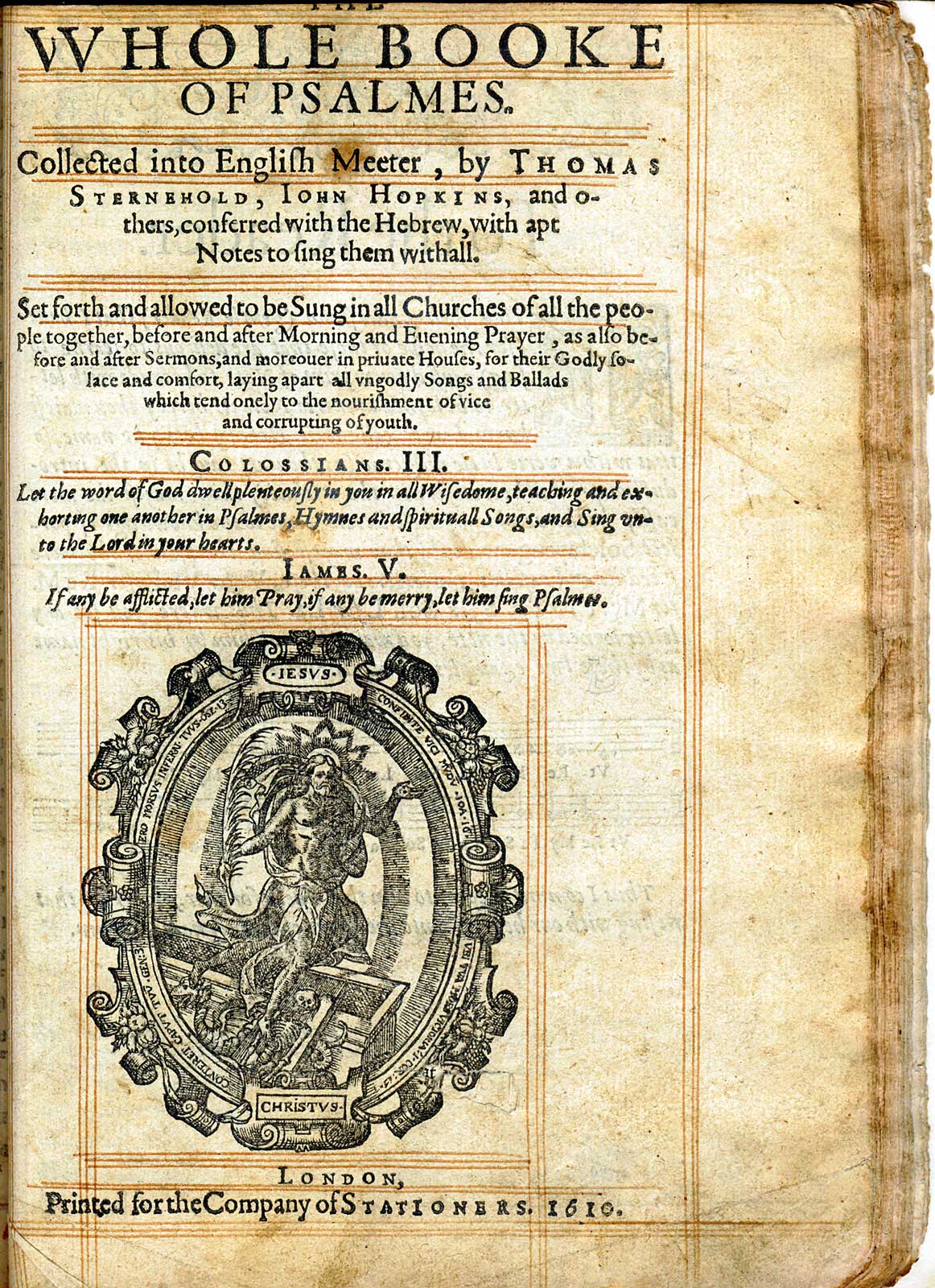 Collected into Engish Meeter, by Thomas Sternehold, John Hopkins and others, conferred with the Hebrew, with apt notes to Sing them withall.Set forth and allowed to be sung in all churches of all the people together, before and after morning and evening prayer, as also before and after sermons, and moreover in private houses, for their Godly solace and comfort, laying apart all ungodly Songs and Ballads which tend only to the nourishment of vice and corrupting of youth.
