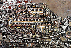 | Jerusalem on the Madaba Mosaic Pilgrim Map. Church of St.George, Madaba, Jordan. (6th cent A.D.) |