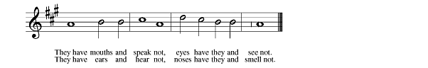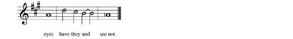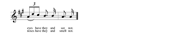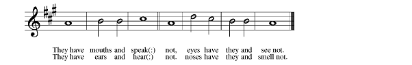 Both phrases occur in the second half of the verse where the chant in alia breve has four accents. In reading there are but two accents, on eyes, see, and noses, smell with a subsidiary stress (rhetorical, not a sense accent, though the point is one of personal predilection) on have, so that have they and forms a dactyl or musical triplet. Eyes, though monosyllabic, has a long vowel. Each phrase contains two (or three) accents only. Such are the data of the problem. The New Cathedral pointing cannot be considered a very satisfactory solution: